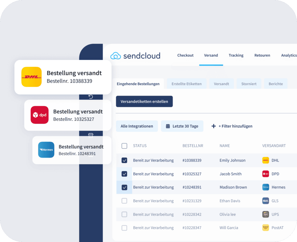 Sendcloud zum Beispiel ist eine Versandsoftware, mit der du Versandetiketten automatisch erstellen, Zeit sparen und Fehler vermeiden kannst. Außerdem kannst du mehrere Paketdienste über eine einzige Plattform verwalten und deinen Versandprozess selbst bei steigendem Bestellvolumen unter Kontrolle behalten.