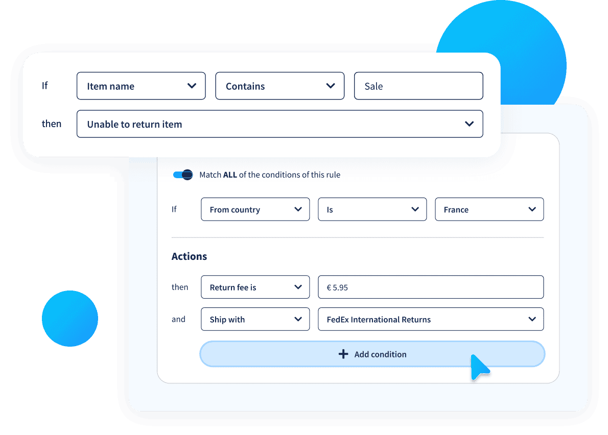 Forget about manual approvals and complicated return policies. Sendcloud allows you to create automated rules that approve or reject returns, assign fees, and manage the entire process.