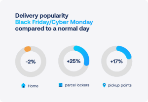 Although pick-up points and parcel lockers are generally considered a reliable delivery method, many of these locations reached capacity during the shopping weekend. As service points ran out of space and parcel lockers filled up, carriers often had to reroute parcels to alternative locations, which made it harder to complete next-day deliveries.